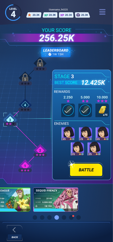 The feature consists of a succession of battles that are time limited. Players progress through the stages and earn a score that will place them in a leaderboard. Adding this competitive mechanic also helped us increase the competitive aspect of our product.